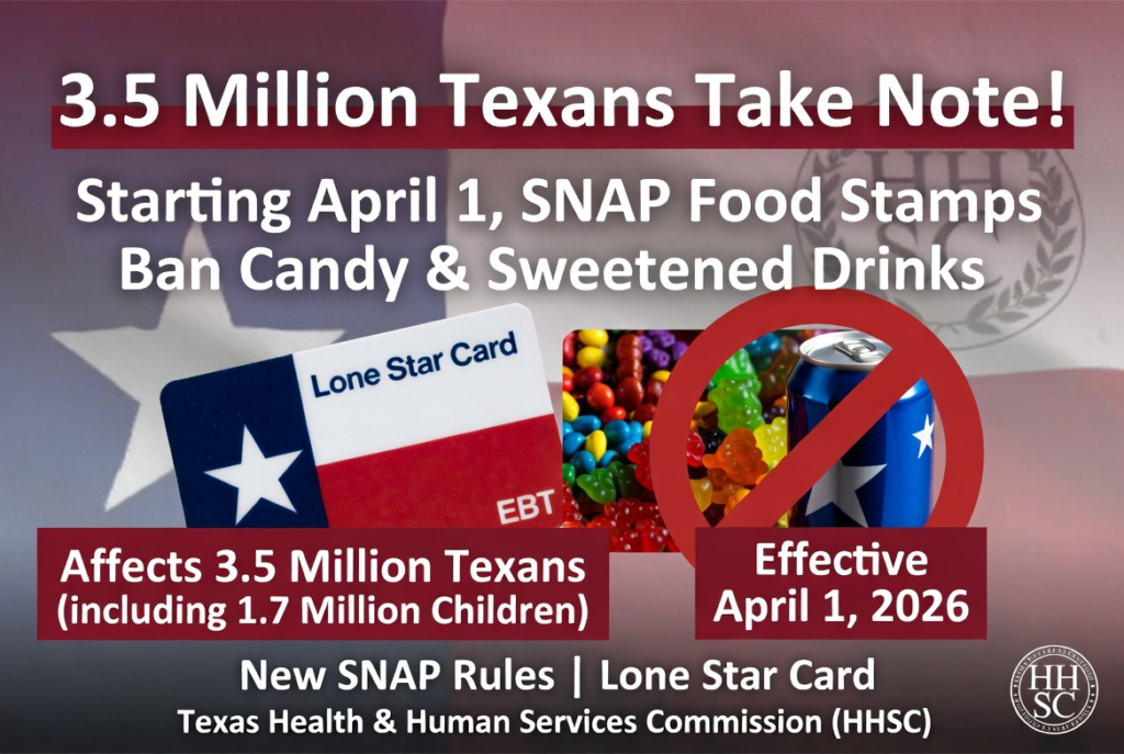 德州卫生与公共服务委员会(HHSC)近日宣布,从2026年4月1日起,使用Lone Star Card(SNAP食品券)的受益人将无法购买糖果及大多数甜饮料。新规明确规定,各类糖果、口香糖,以及每份含5克以上添加糖或任何人工甜味剂的饮料